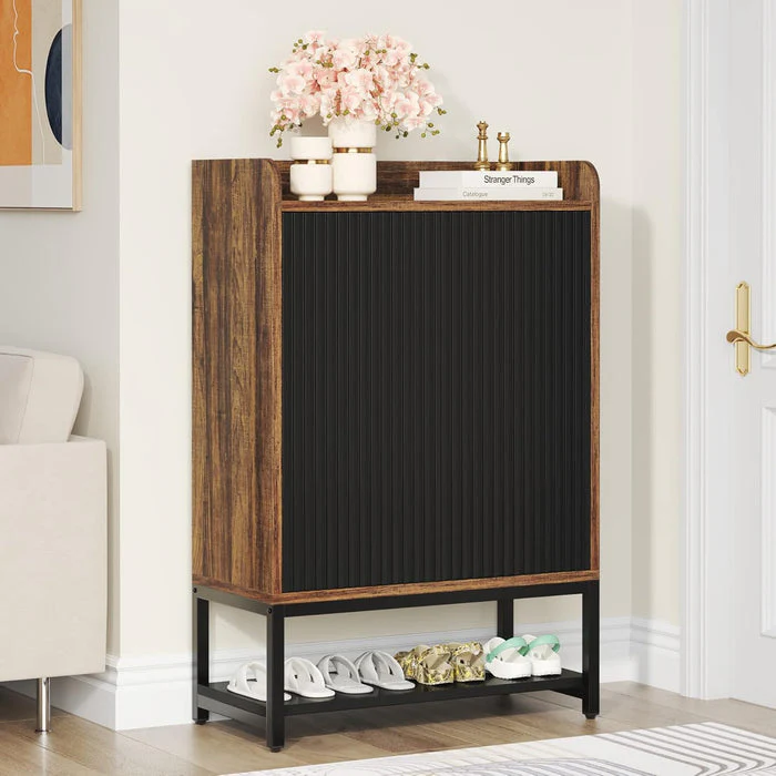 Vintage et minimaliste - ce meuble à chaussures se vante d'une finition noire et marron accentuée par des lignes symétriques sur les façades de la porte, ajoutant une touche de sophistication et de style rétro à l'ensemble du cadre.